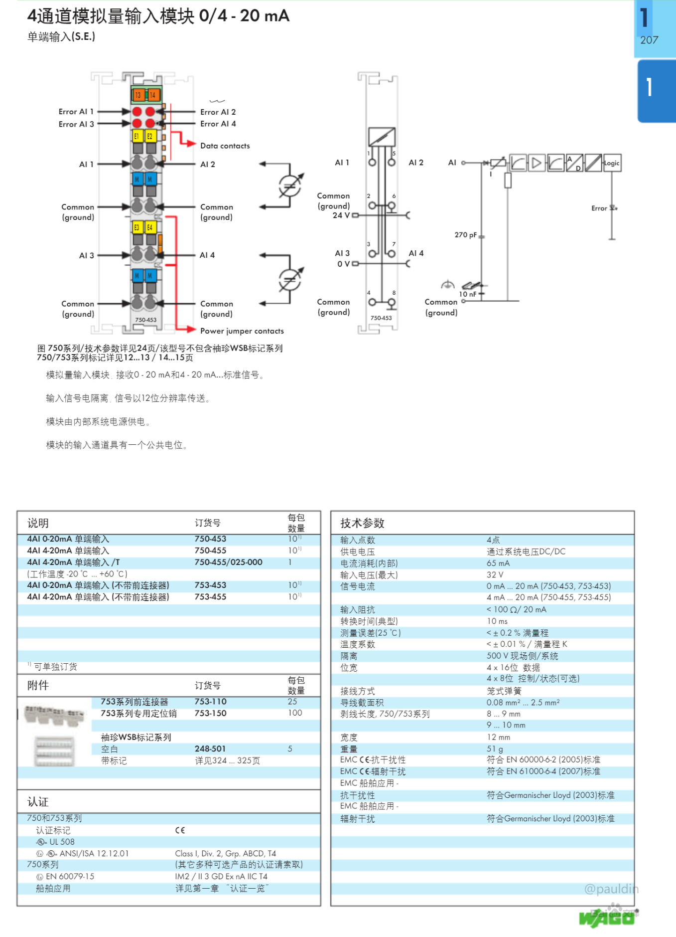 德国WAGO万可4通道模拟量输入模块,750-455自营现货,工业超市